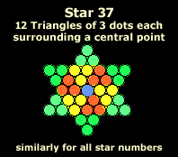 For example, the Star of 13 dots consists of 12 T1 triangles of 1 dot each surrounding a center point. The Star of 37 dots consists of 12 T2 triangles of 3 dots each surrounding a CP (see picture on right), etc.