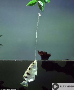 Archerfish prey on land-based insects and other small animals by shooting them down with water droplets from their specialized mouths. It compensates for the curving of the jet through gravity and adjusts for the way light bends at the boundary between water and air. They also "modulate" the velocity of the water jet as they spit to alter its shape through the air. The head of the water jet increases in volume from liquid arriving from its tail to form a large drop, which hits insect prey with greater force. Adult fish usually hit the target on the first shot. Perhaps they should be called sniperfish. see it here