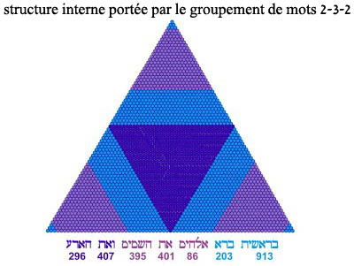 Comme nous l'avons vu, Genèse 1:1 est composé de 28 lettres, et le premier mot, "Bérésheit", contient 6 lettres. 6 et 28 sont respectivement les 3ᵉ et 7ᵉ nombres triangulaires. Ces nombres 3 et 7 sont au cœur de Genèse 1:1.