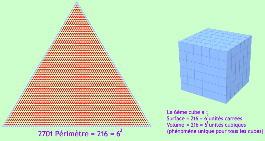 Une autre propriété du 73ᵉ triangle (2701 points) : Son périmètre est de 216 points, et 216 = 63 (6 est un nombre parfait). De plus, le 6ᵉ cube est le seul cube dont l’aire totale des faces (en unités carrées) est égale à son volume (en unités cubiques)[2]. À noter également que le premier mot de Genèse 1:1 ("בראשית") contient 6 lettres et que le reste du verset est composé de 6 mots (voir Zohar, Hakdama Bereisheit 9a).
