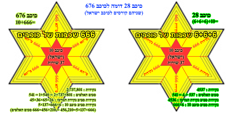 כוכב 10 (ישראל) נוצר על ידי מיזוג של שני משולשים מספר 28. מעניין לציין כי כוכב 28 מציג מאפיינים דומים לכוכב 676. הוא מורכב מכוכב ישראל (10) במרכז, מוקף ב-18 שכבות (6+6+6) של כוכבים חדשים המכילים יחד 6×666 נקודות.