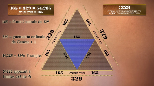 Ainsi, 165 × 329 forme le 329ᵉ triangle de 54 285 points (1+2+3+...+329=54 285) où le point central de chaque côté est le 165ᵉ point. Étonnamment, le nombre 54 285 apparaît pour la première fois à partir du 2701ᵉ chiffre de Pi.